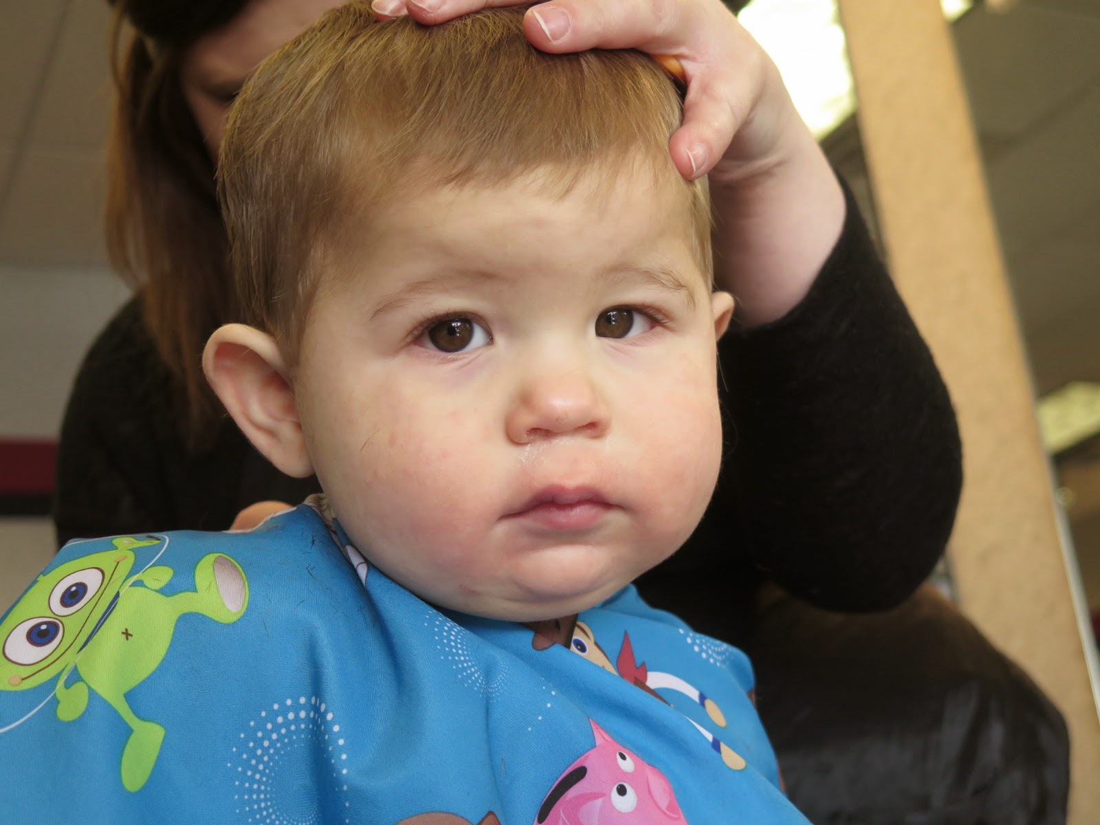 He did fantastic. He sat still and he didn't make a peep. As usual, the EXACT opposite of what Kade did. Kade screamed and cried so loud that he forgot to breathe at one point and actually turned purple at his first cut. Not Mason. I didn't even have to reach into my bag of tricks to distract him!